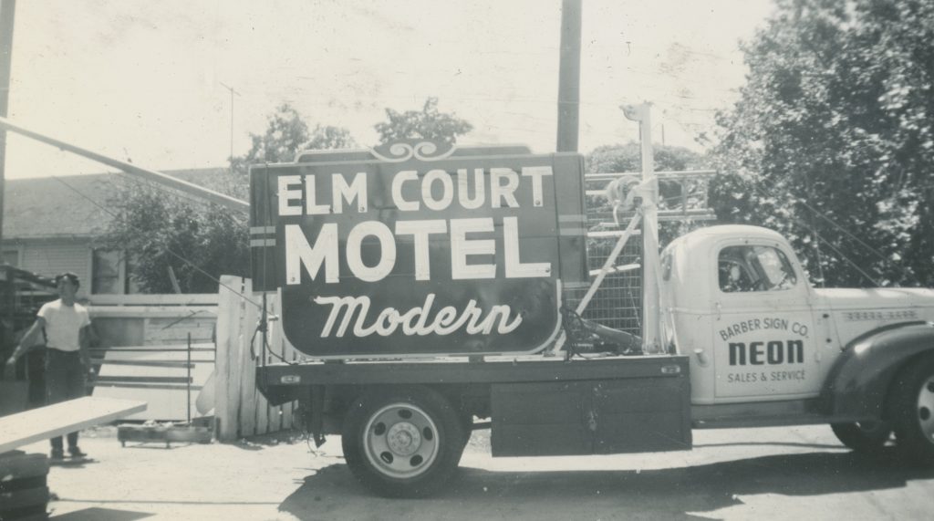 Indeed. Paul’s photo collection and knowledge have been a tremendous help to me in research on Petaluma’s signs. And it was through Heather David, author of Motel California and Mid-Century by the Bay that I met Paul. She and her husband spotted the Elm Court sign on their way home to San Jose after Heather had given a presentation at the Santa Rosa Library. They pulled over and took photos of the sign and noted the Barber name. She returned home and started doing research and one thing led to another.