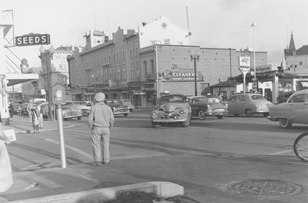 Intersection of Western Avenue and Keller Street. Tip Top Cleaners was located next door to the Continental Hotel. A fire in May 1968 destroyed both buildings. Chase Bank now occupies the site of the hotel. The Mobile gas station is where Wells Fargo is today.